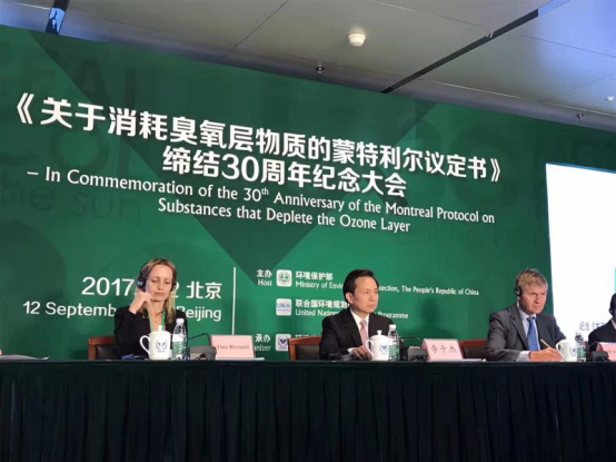 在国际保护臭氧层日即将到来之际,《关于消耗臭氧层物质的蒙特利尔议定书》(以下简称蒙特利尔议定书)缔结三十周年纪念大会在京举行,国务院总理李克强致贺信,环境保护部部长李干杰宣读贺信并讲话。